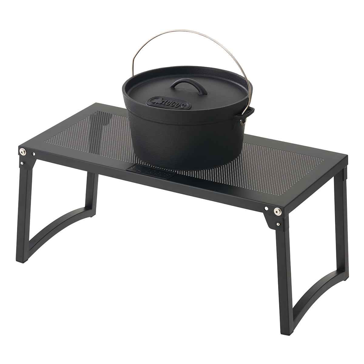 A steel table that can hold a heated Dutch oven.